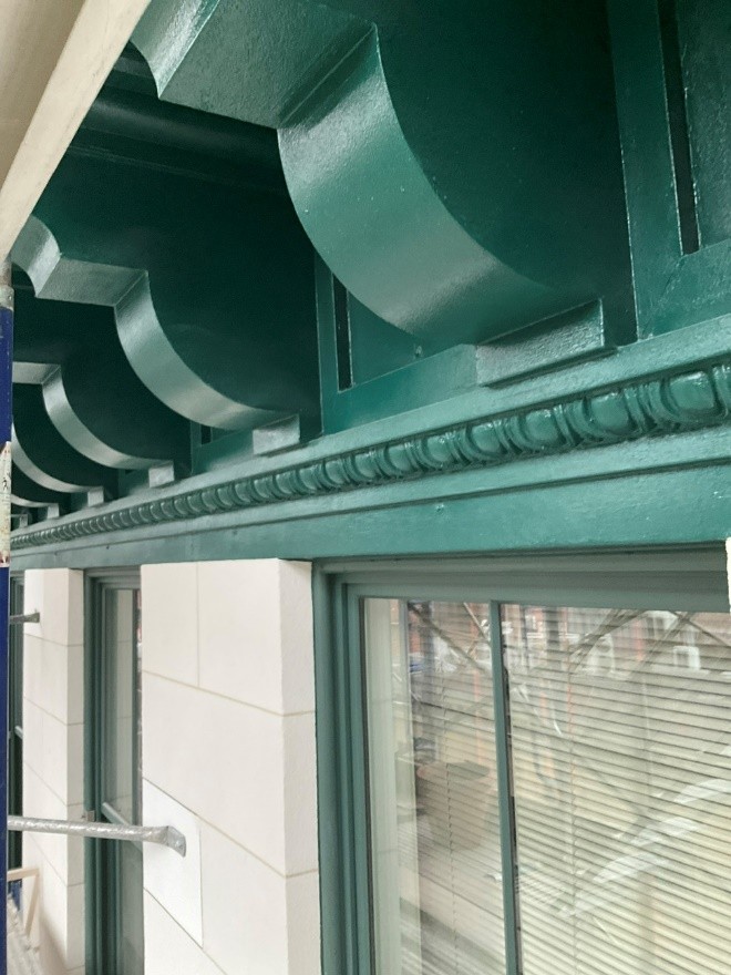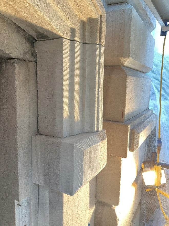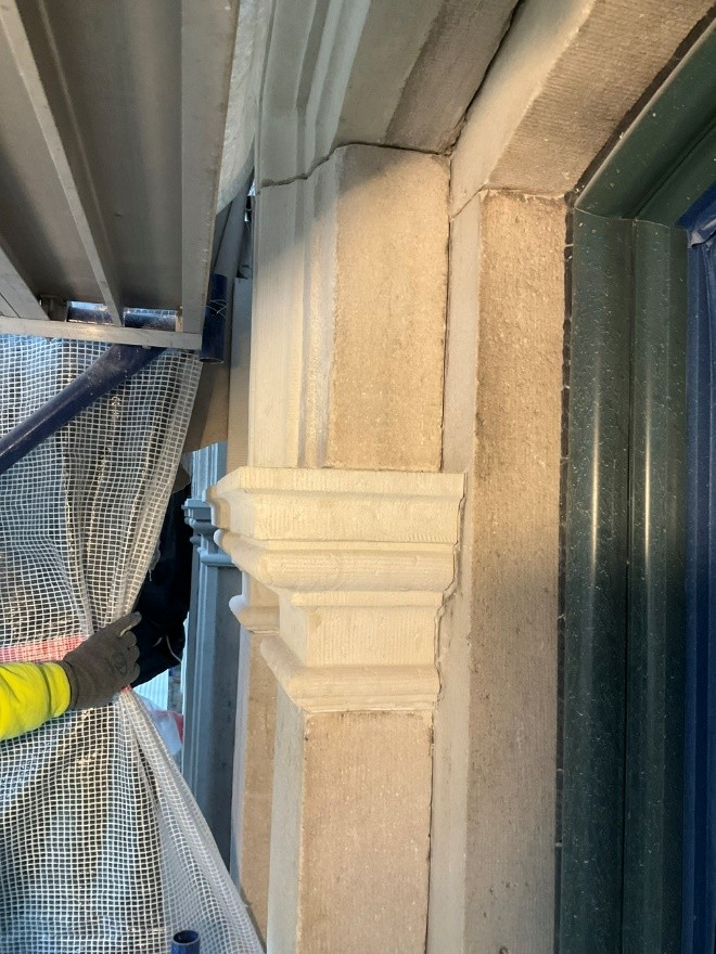 Scope of Repairs: Marble patch repair and replacement, stucco patch repairs, and restoration of sheet metal cornice.